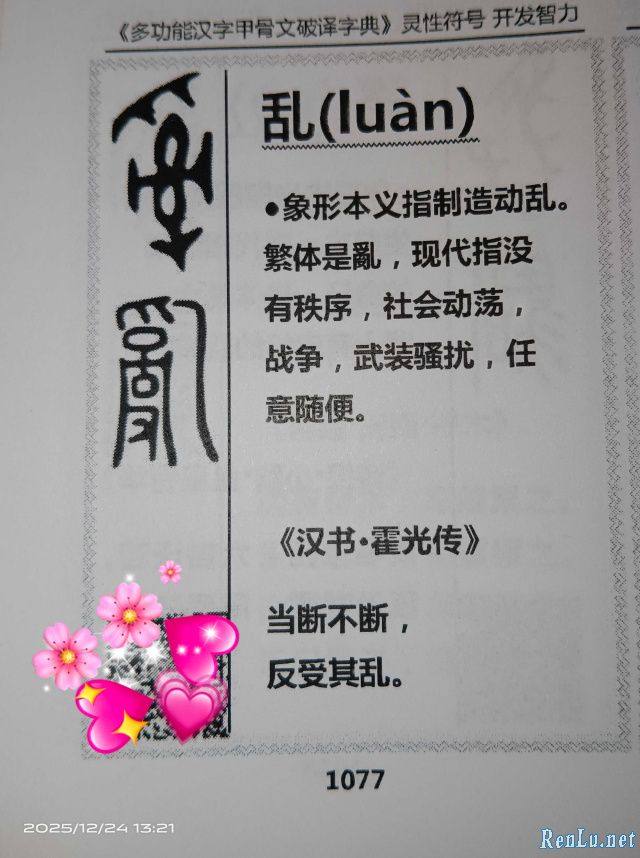附 白话版《说文解字》:乱,理清杂丝。字形采用"乙"作边旁,"乙"表示理清纷杂的丝绪。