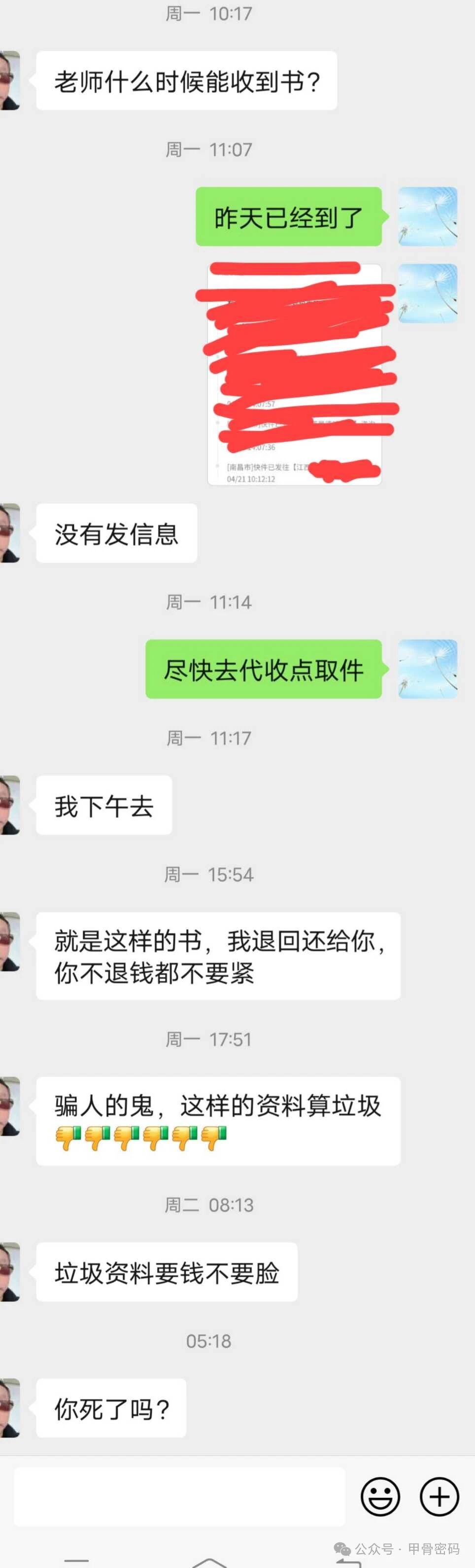 这位读者订了2本《姓名隐藏的命运密码》,订书之前客客气气,十分有礼貌,拿到书之后翻脸比翻书还快,屡次三番恶言恶语,如图,说甲骨文资料是垃圾,今天更是留言“你死了吗?”对于这类读者的毁誉,一般不予理会,本人也不想与之争论,但此人还紧追不舍,紧咬不放,变本加厉,这是逼着要本人回复他。