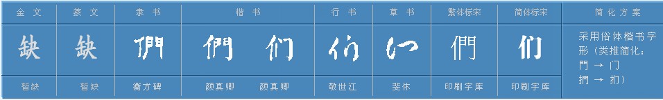 门,代表建筑或建筑群的出入口,代表一家、一族。们,甲、金、篆文字形资料暂缺,隶书=(人,人丁)+(门,代表家、族),推测造字本义:同属一家或一族的若干人。